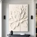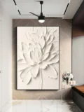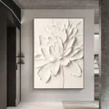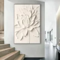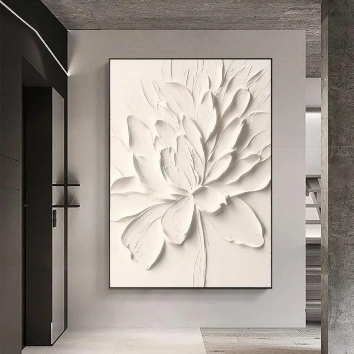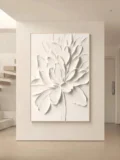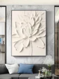Bức tranh khắc họa một bông hoa với những đường nét tinh tế, nổi bật qua kỹ thuật texture nổi. Màu trắng thanh khiết không chỉ tạo cảm giác nhẹ nhàng mà còn mang đến sự tinh tế và sang trọng. Các cánh hoa được thể hiện một cách sống động, như đang đón nhận ánh sáng, tạo ra chiều sâu và cảm xúc cho tác phẩm. Phong cách hiện đại và Wabi-Sabi hòa quyện, mang lại vẻ đẹp tự nhiên, giản dị mà đầy cảm hứng. Bức tranh như một lời mời gọi sự thư giãn và bình yên, phù hợp cho không gian sống ấm cúng và gần gũi.