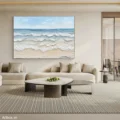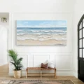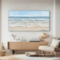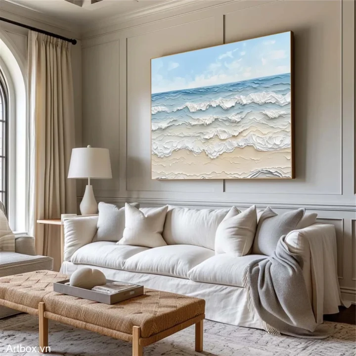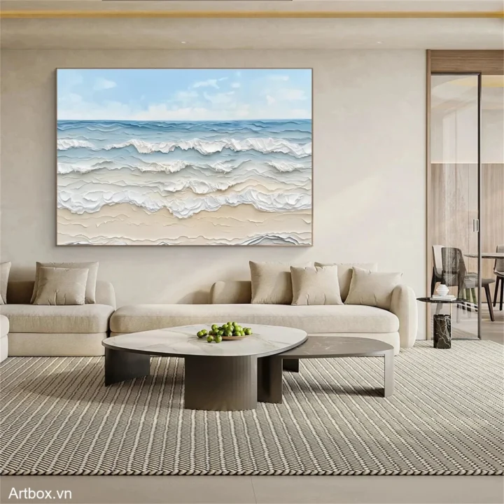 Bức tranh mang đến cảm giác yên bình với hình ảnh biển cả bao la. Những làn sóng nhẹ nhàng vỗ về bờ cát, tạo nên một không gian thư giãn và thanh thoát. Màu xanh dương tươi sáng hòa quyện cùng sắc trắng của sóng nước, đem lại sự tươi mới và sức sống. Kỹ thuật texture nổi tạo chiều sâu cho bức tranh, khiến cho người xem như cảm nhận được sự chuyển động của nước. Phong cách hiện đại và tối giản giúp tác phẩm dễ dàng hòa mình vào không gian sống, mang lại cảm giác gần gũi và dễ chịu.