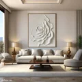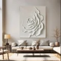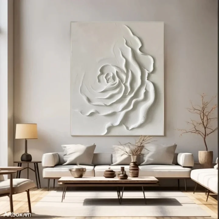Bức tranh khắc họa vẻ đẹp tinh tế của một bông hoa hồng với những đường nét mềm mại và tinh xảo. Màu trắng thuần khiết tạo nên sự thanh thoát, nhẹ nhàng, mang lại cảm giác dịu dàng và ấm cúng. Kỹ thuật texture nổi làm nổi bật chiều sâu và sự sống động của hình ảnh, khiến bông hoa như đang nở rộ trước mắt. Phong cách hiện đại và tối giản của bức tranh phù hợp với nhiều không gian sống, tạo điểm nhấn thanh lịch và nghệ thuật cho ngôi nhà. Đây là một tác phẩm hoàn hảo cho những ai yêu thích sự tinh tế và giản dị trong nghệ thuật.
