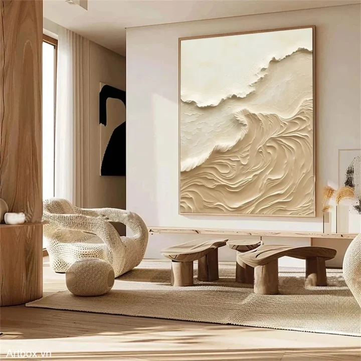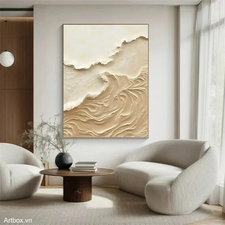Bức tranh mang đến một cảm giác êm dịu và trầm lắng, với những đường nét uốn lượn như sóng cát. Màu nâu be nhẹ nhàng tạo ra sự ấm áp, gợi nhớ đến vẻ đẹp của thiên nhiên. Kỹ thuật texture nổi giúp bức tranh trở nên sống động, tạo chiều sâu và cảm giác chạm vào. Phong cách hiện đại và tối giản được thể hiện rõ ràng qua sự tinh tế trong từng đường nét, mang lại sự thư giãn cho không gian. Đây là tác phẩm lý tưởng cho những ai yêu thích sự yên bình và sang trọng trong nghệ thuật.