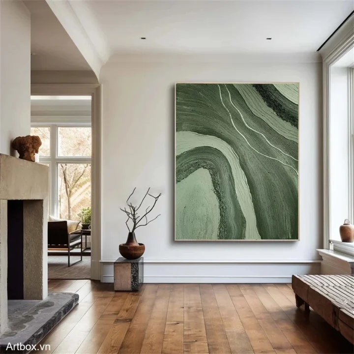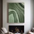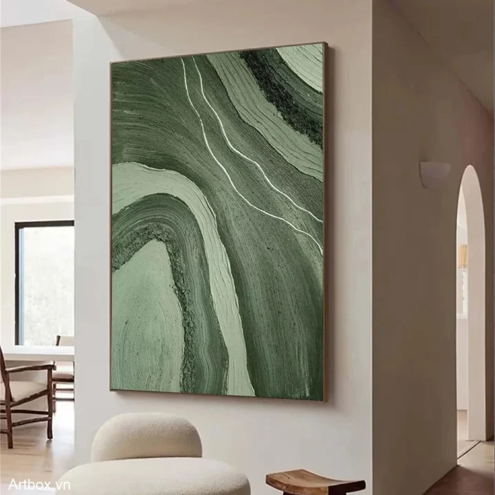 Bức tranh mang đến một cảm giác thanh bình với những đường nét mềm mại và màu xanh lá tươi mát. Các đường cong uốn lượn tạo nên sự chuyển động nhẹ nhàng, như thể hiện những lớp đất đai trong thiên nhiên. Màu sắc hòa quyện tinh tế, gợi nhớ đến những cánh rừng xanh mướt và những con suối trong lành. Kỹ thuật vẽ phẳng giúp bức tranh trở nên hiện đại và tối giản, phù hợp với không gian sống đương đại. Cảm xúc mà tác phẩm mang lại là sự dịu nhẹ, ấm cúng, khiến người xem cảm thấy thư giãn và gần gũi với thiên nhiên.
