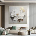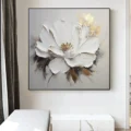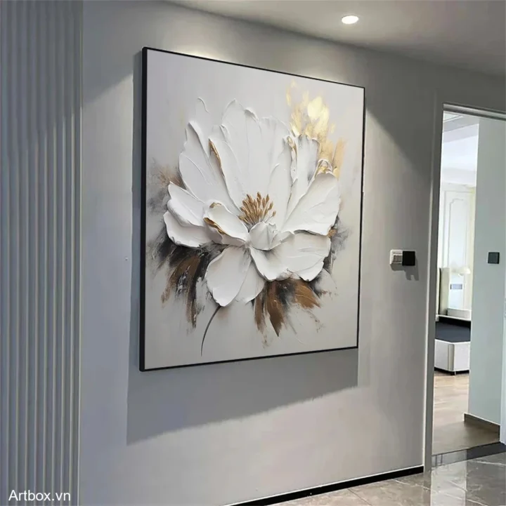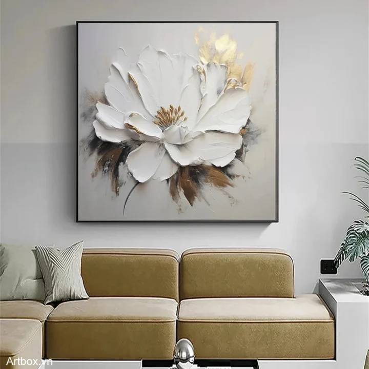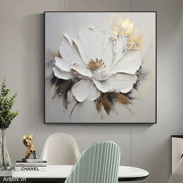 Bức tranh khắc họa một bông hoa trắng tinh khiết, nổi bật với những cánh hoa dày dạn, tạo cảm giác sống động và chân thật. Những đường nét mềm mại và sắc thái màu trắng tinh khiết mang lại cảm giác thanh thoát, nhẹ nhàng. Lớp sơn dày tạo ra texture nổi, khiến bức tranh trở nên ấn tượng và thu hút ánh nhìn. Những điểm nhấn màu nâu nhẹ nhàng ở phần dưới bông hoa tạo sự cân bằng, làm nổi bật vẻ đẹp tự nhiên. Toàn bộ tác phẩm mang đến một cảm giác ấm cúng, dễ chịu, thích hợp cho không gian sống hiện đại.