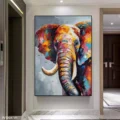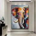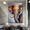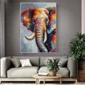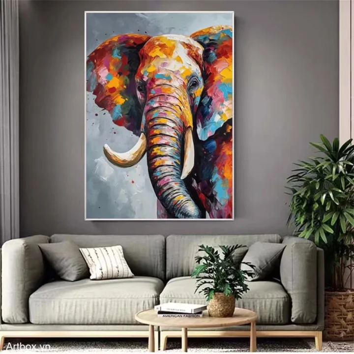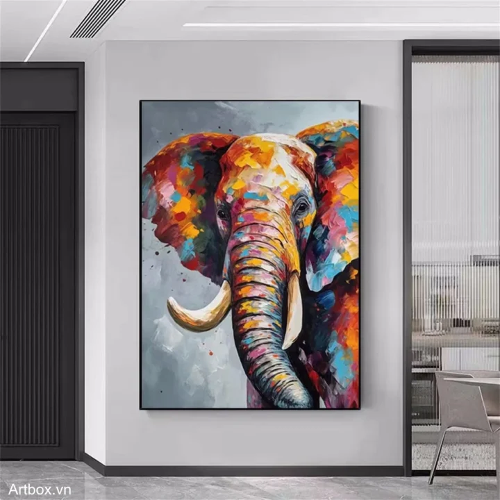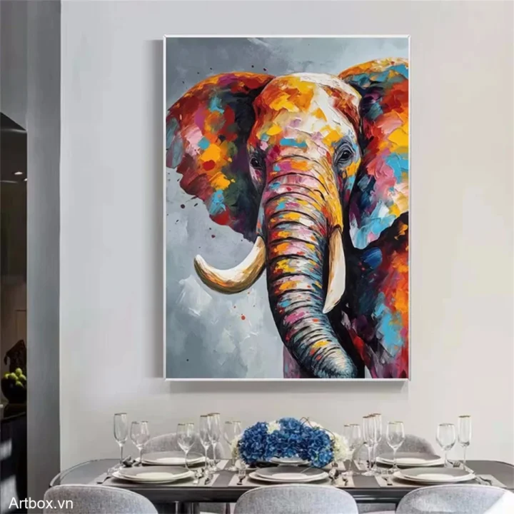Bức tranh thể hiện hình ảnh một chú voi với những gam màu rực rỡ và sống động, mang đến cảm giác vui tươi và mạnh mẽ. Các sắc thái từ vàng, cam đến xanh dương hòa quyện với nhau tạo nên một bức chân dung đầy sức sống. Đường nét của chú voi được thể hiện một cách tinh tế, nổi bật giữa nền màu xám nhẹ nhàng. Bức tranh không chỉ tôn vinh vẻ đẹp của động vật mà còn khơi gợi cảm xúc tích cực, mang lại nguồn năng lượng mới cho không gian xung quanh.