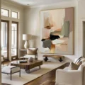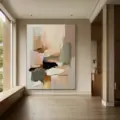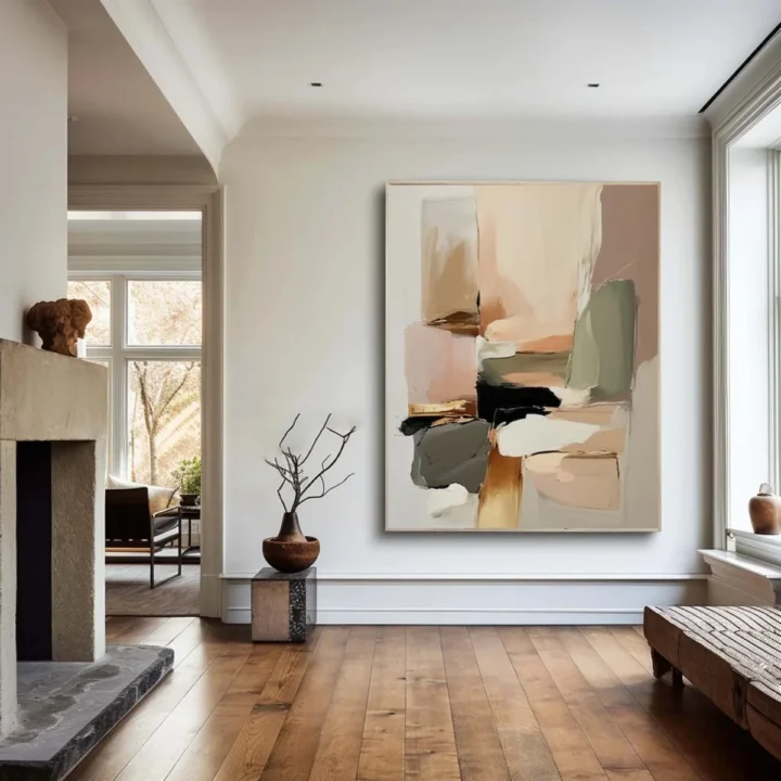Bức tranh mang đến một không gian tĩnh lặng và thư giãn với các gam màu pastel nhẹ nhàng. Những khối màu được bố trí một cách hài hòa, tạo nên sự chuyển tiếp mềm mại giữa các sắc thái khác nhau. Sự kết hợp giữa các mảng màu hồng, xanh nhạt và nâu nhẹ không chỉ thể hiện sự tinh tế mà còn gợi lên cảm giác dịu dàng, gần gũi. Kỹ thuật vẽ phẳng giúp bức tranh trở nên hiện đại và thanh thoát, mang lại một cái nhìn tươi mới cho không gian sống. Đây là tác phẩm hoàn hảo để tạo nên điểm nhấn cho những không gian cần sự yên bình và thư giãn.
