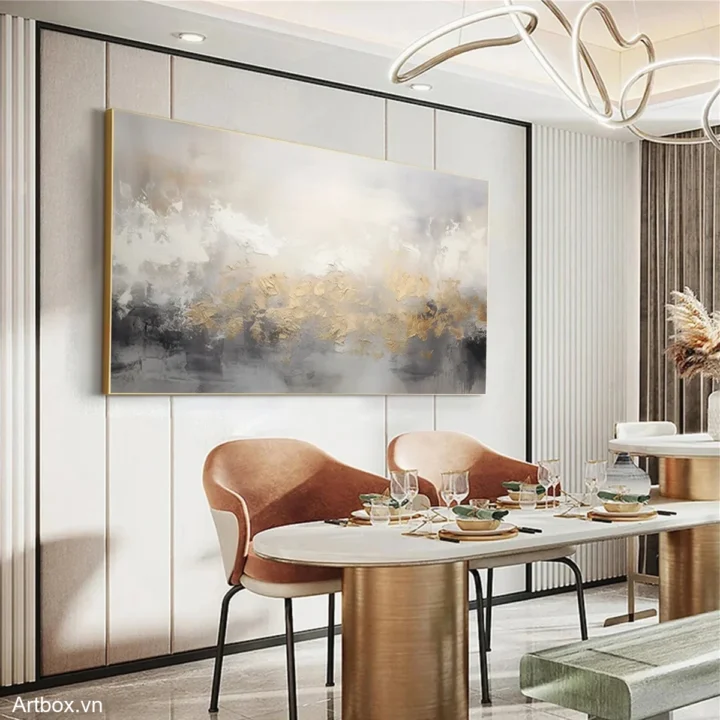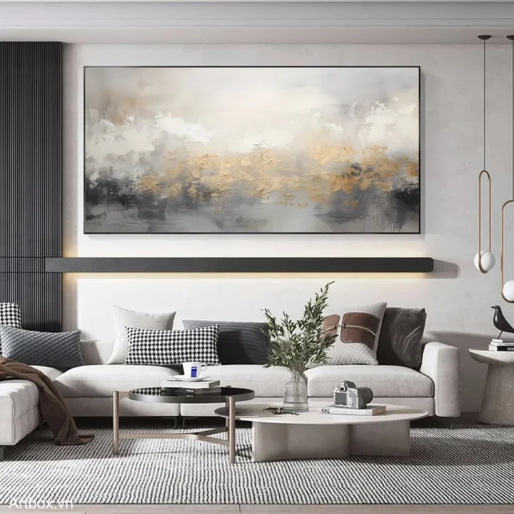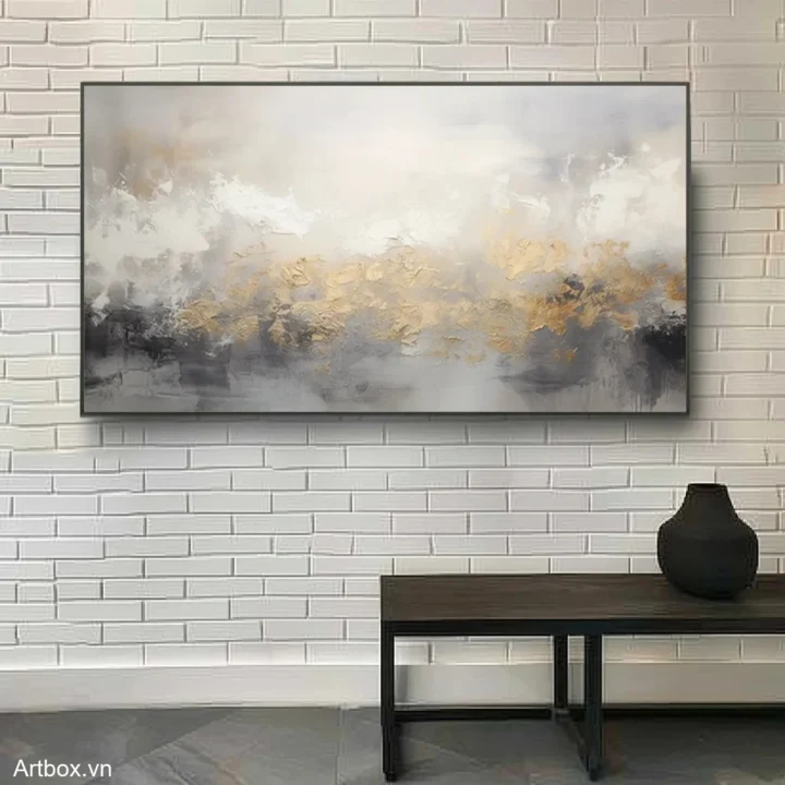 Bức tranh mang đến một không gian trừu tượng đầy cảm xúc với sự kết hợp tinh tế giữa các tông màu xám nhẹ nhàng và những chi tiết vàng lấp lánh. Các lớp màu được sắp đặt một cách ngẫu hứng, tạo nên chiều sâu và sự chuyển động trong tác phẩm. Kỹ thuật texture nổi làm nổi bật các đường nét, tạo cảm giác sống động và gần gũi. Ánh sáng vàng như ánh nắng xuyên qua những đám mây, mang lại cảm giác ấm áp và thư thái. Đây là một tác phẩm nghệ thuật hoàn hảo cho không gian hiện đại, tạo điểm nhấn ấn tượng và mang đến sự bình yên cho người chiêm ngưỡng.