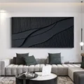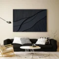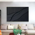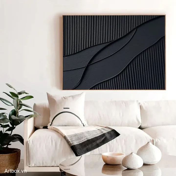 Bức tranh mang đến một cảm giác mạnh mẽ và bí ẩn với những đường nét uốn lượn và kết cấu nổi bật. Màu đen chủ đạo tạo nên sự sang trọng và tinh tế, trong khi các hình khối dọc và ngang tương phản nhau, tạo ra một nhịp điệu thú vị cho mắt người xem. Kết cấu nổi không chỉ tạo chiều sâu mà còn khơi gợi cảm xúc, khiến người xem cảm nhận được sự sống động trong từng đường nét. Đây là một tác phẩm phù hợp cho không gian hiện đại, nơi mà sự tối giản và nghệ thuật giao thoa.