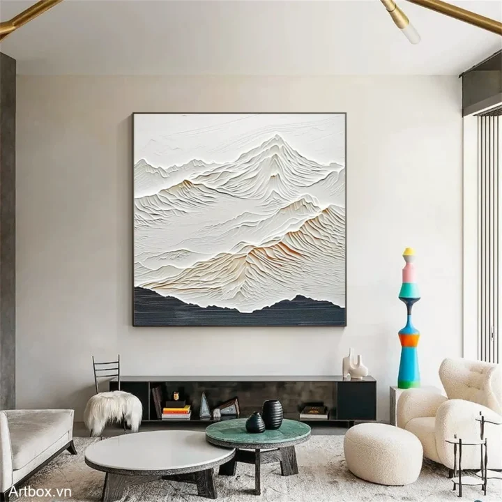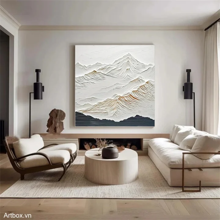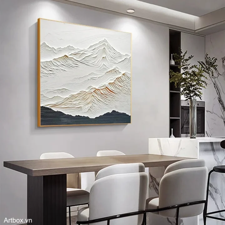 Bức tranh mang đến một cảm giác thanh bình với hình ảnh những ngọn núi trắng nổi bật trên nền tối. Kỹ thuật texture nổi tạo ra chiều sâu và sự sống động cho các đường nét uốn lượn, mô phỏng những đỉnh núi hùng vĩ. Màu trắng chủ đạo kết hợp với các sắc thái nhẹ nhàng khác, tạo nên một không gian thư giãn và yên tĩnh. Bức tranh không chỉ là một tác phẩm nghệ thuật mà còn là một điểm nhấn tinh tế trong không gian sống hiện đại, khơi gợi cảm xúc và sự suy tư cho người ngắm nhìn.
