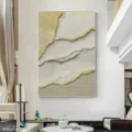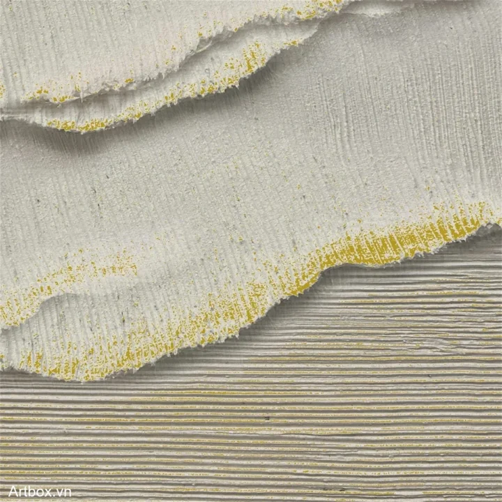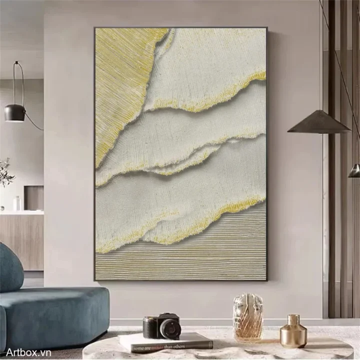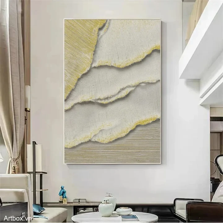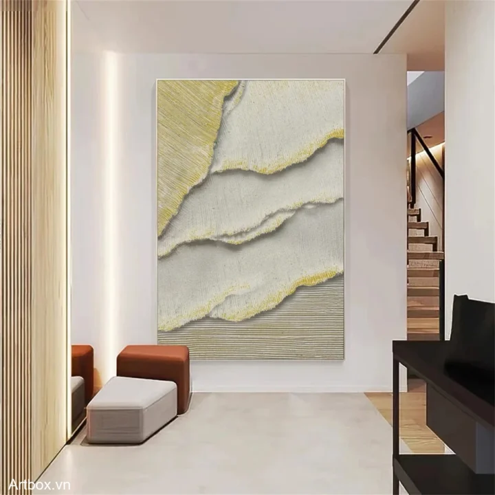 Bức tranh mang đến một cảm giác tĩnh lặng và thư giãn với những đường nét mềm mại, uốn lượn tạo thành những lớp sóng nhẹ nhàng. Sự kết hợp giữa các tông màu trung tính và những điểm nhấn vàng rực rỡ tạo nên một không gian hiện đại và sang trọng. Kỹ thuật texture nổi làm nổi bật chiều sâu và sự sống động của bức tranh, khiến nó trở nên hấp dẫn và thu hút ánh nhìn. Đây là một tác phẩm nghệ thuật lý tưởng cho những không gian cần sự nhẹ nhàng, ấm áp và tinh tế.