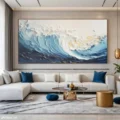 Bức tranh mang đến cảm giác mạnh mẽ và tươi mới với hình ảnh những con sóng vỗ bờ. Sự kết hợp giữa các tông màu xanh dương, từ nhẹ nhàng đến sâu thẳm, tạo nên chiều sâu và chuyển động cho tác phẩm. Kỹ thuật texture nổi được sử dụng khéo léo, tạo ra cảm giác xúc giác như bạn có thể chạm vào từng lớp sóng. Những điểm nhấn màu trắng và vàng nhạt gợi nhớ đến ánh sáng mặt trời chiếu rọi trên mặt nước, mang lại sự tươi sáng và sinh động. Tác phẩm này không chỉ là một bức tranh, mà còn là một trải nghiệm cảm xúc, mang lại sự thư giãn và bình yên cho không gian sống.