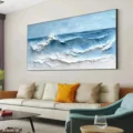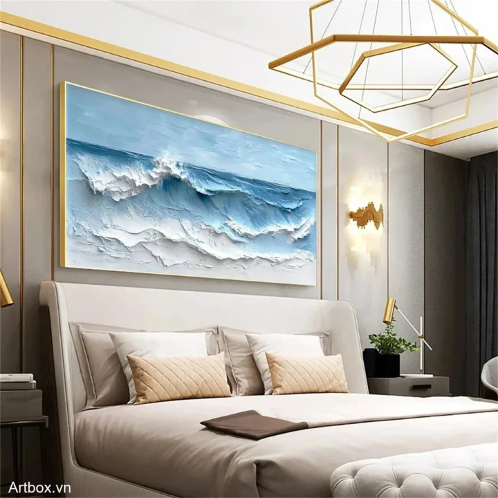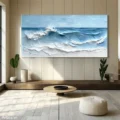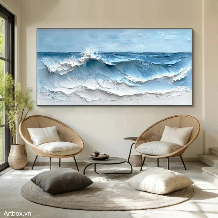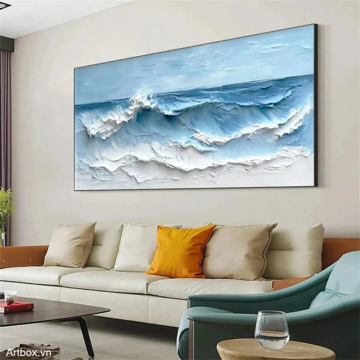 Bức tranh mang đến hình ảnh sống động của những con sóng vỗ bờ, với độ nổi rõ nét và màu sắc xanh dương nhẹ nhàng. Những lớp sơn dày tạo nên cảm giác chiều sâu và sự chuyển động của nước, khiến người xem cảm nhận được sự tươi mới và yên bình của biển cả. Ánh sáng phản chiếu trên mặt nước tạo ra những gam màu khác nhau, từ xanh lam đến trắng, tạo nên một bức tranh vừa mạnh mẽ vừa dịu dàng. Đây là tác phẩm hoàn hảo cho không gian thư giãn, mang lại cảm giác gần gũi với thiên nhiên và sự thanh thản trong tâm hồn.
