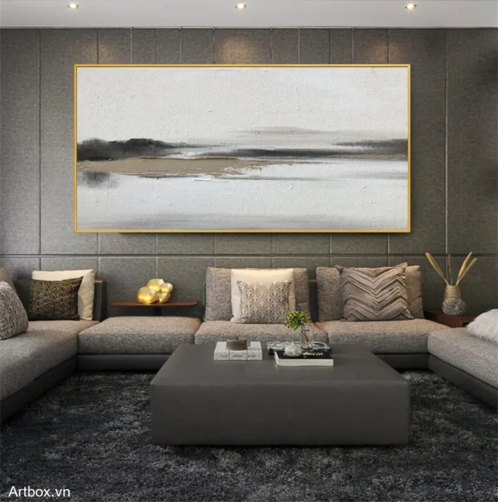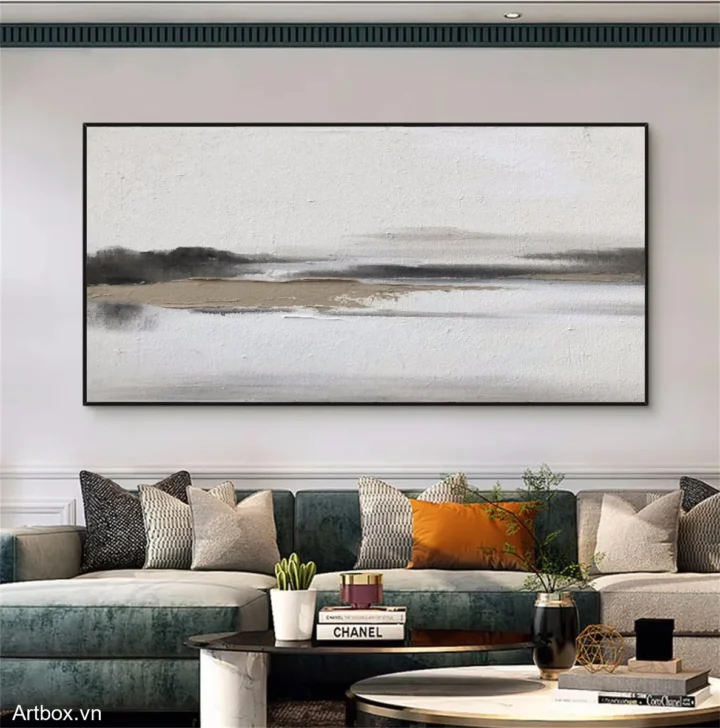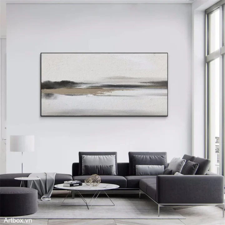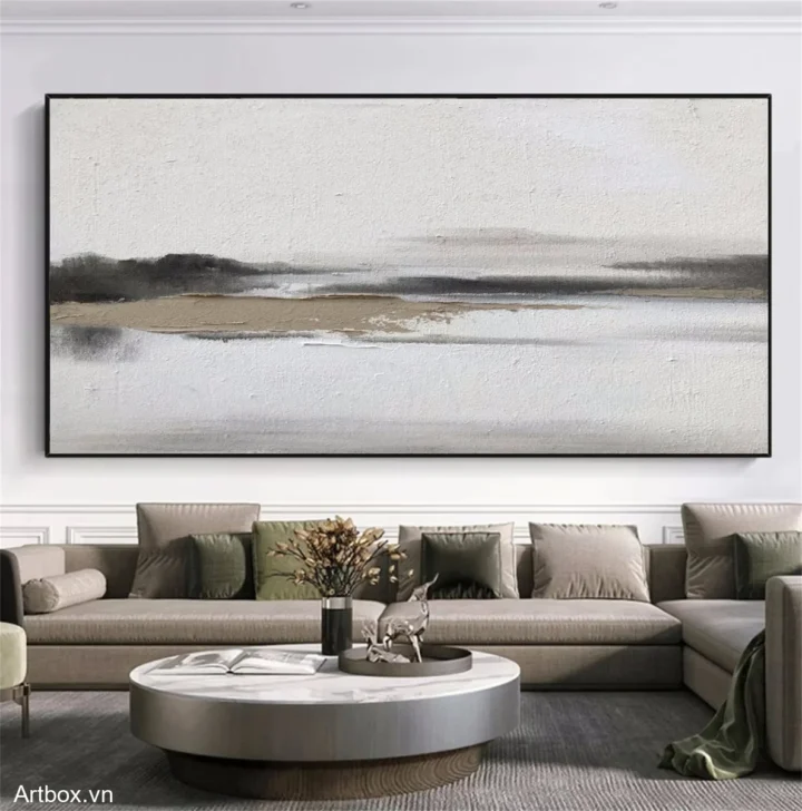 Bức tranh mang đến một không gian tĩnh lặng với những sắc thái nâu be nhẹ nhàng, hòa quyện hài hòa giữa các lớp màu. Những đường nét mềm mại, mịn màng tạo cảm giác thư thái, như một làn sóng nhẹ nhàng lướt qua tâm hồn. Sự kết hợp giữa các tông màu trung tính và cách thể hiện tinh tế giúp bức tranh trở thành một điểm nhấn nổi bật trong không gian sống, đồng thời tạo ra cảm giác ấm áp và gần gũi. Tác phẩm không chỉ là một bức tranh, mà còn là một trải nghiệm nghệ thuật, khơi gợi cảm xúc và suy tư cho người xem.
