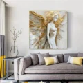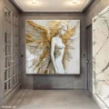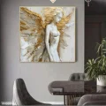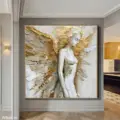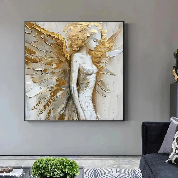 Bức tranh khắc họa hình ảnh một thiên thần với đôi cánh rộng lớn, thể hiện sự thanh thoát và mạnh mẽ. Nét vẽ sử dụng kỹ thuật texture nổi, tạo chiều sâu và cảm giác sống động cho hình thể. Màu vàng rực rỡ hòa quyện với các tông màu sáng khác, mang lại cảm giác ấm áp và dịu nhẹ. Thiên thần đứng trong tư thế thanh thoát, gương mặt biểu cảm nhẹ nhàng, như đang lắng nghe âm thanh của cuộc sống xung quanh. Bức tranh không chỉ là một tác phẩm nghệ thuật mà còn truyền tải thông điệp về sự tự do và vẻ đẹp trong sự hoàn mỹ.