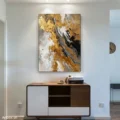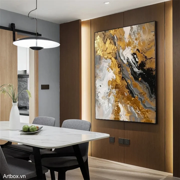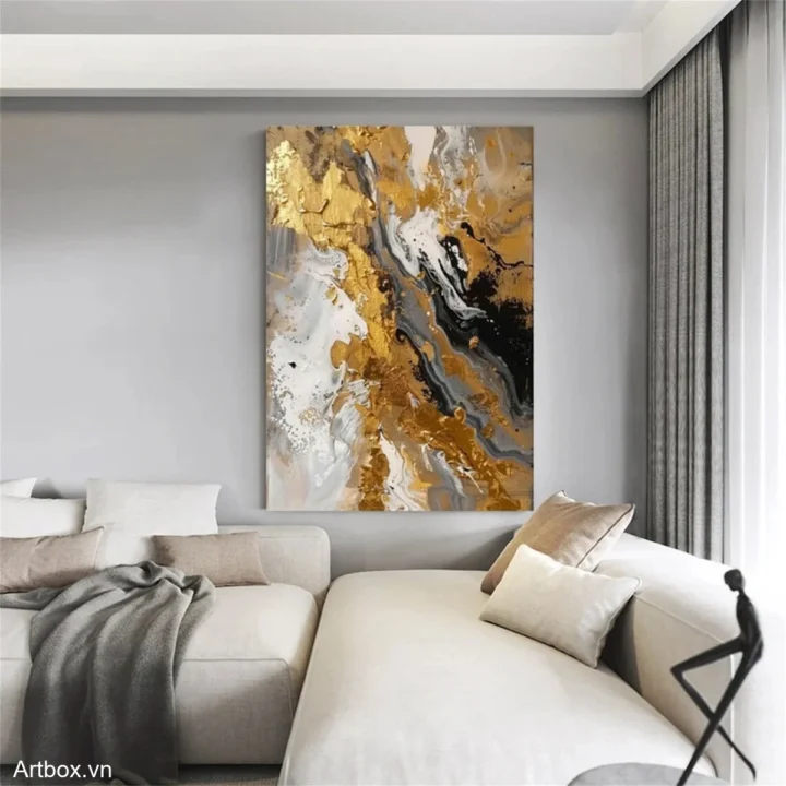Bức tranh thể hiện sự hòa quyện giữa các tông màu vàng, đen, trắng và xám, tạo nên một không gian trừu tượng đầy sức sống. Các đường nét uốn lượn, mềm mại kết hợp với các lớp màu sắc dày, tạo chiều sâu và cảm giác động. Những mảng vàng lấp lánh nổi bật giữa nền tối, mang lại cảm giác sang trọng và hiện đại. Bức tranh không chỉ là một tác phẩm nghệ thuật mà còn là một điểm nhấn mạnh mẽ cho không gian sống, khiến người xem cảm nhận được năng lượng và sự sáng tạo từ từng chi tiết.