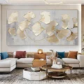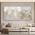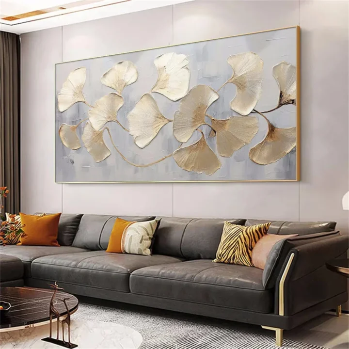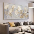 Bức tranh khắc họa những chiếc lá ginkgo nhẹ nhàng, được tạo hình bằng kỹ thuật texture nổi, mang lại chiều sâu và sự sống động. Màu vàng ánh kim của lá nổi bật trên nền xám nhạt, tạo nên một sự tương phản tinh tế, vừa ấm áp vừa thanh thoát. Các đường nét mềm mại của lá như đang nhẹ nhàng bay trong gió, gợi lên cảm giác thư giãn và bình yên. Tác phẩm này không chỉ là một phần trang trí, mà còn là một điểm nhấn nghệ thuật, mang lại sự hài hòa và cảm xúc cho không gian sống.
