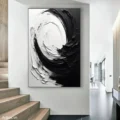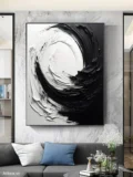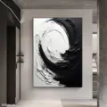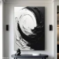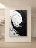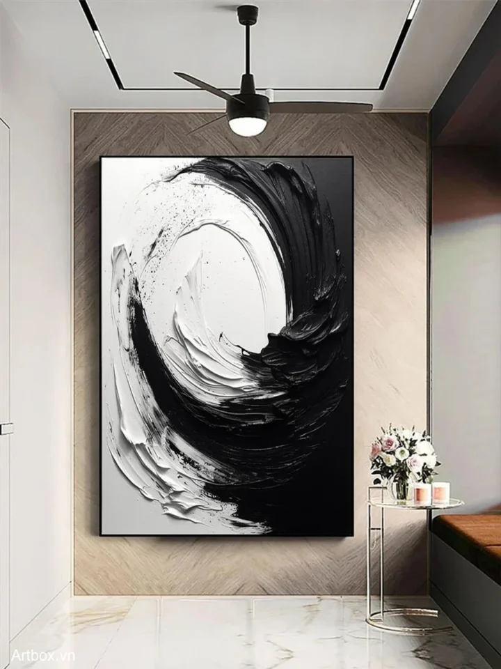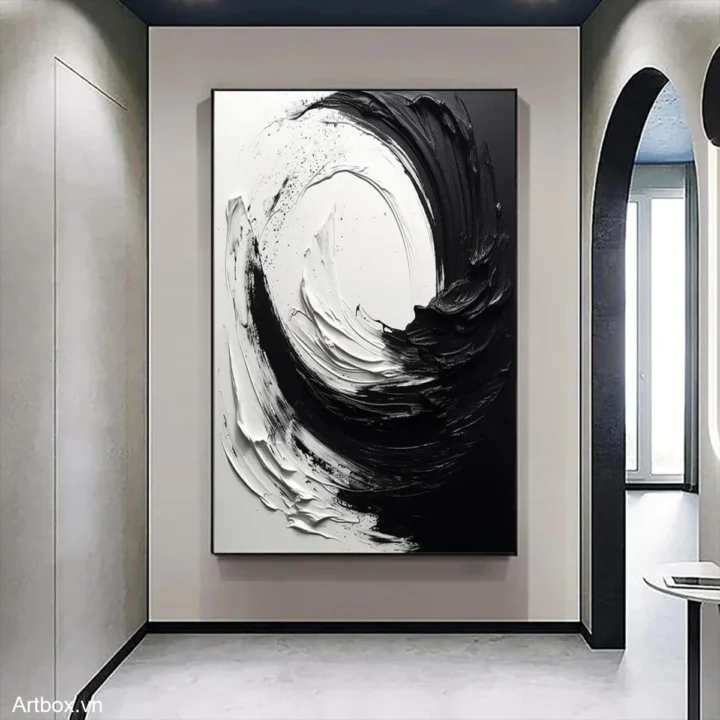 Bức tranh mang đến một cảm giác mạnh mẽ và tĩnh lặng với sự tương phản rõ rệt giữa màu đen và trắng. Những đường nét xoáy tròn, mềm mại nhưng cũng đầy quyết liệt tạo ra một không gian tràn đầy năng lượng và sự chuyển động. Kỹ thuật texture nổi được sử dụng khéo léo, khiến cho bức tranh trở nên sống động và có chiều sâu. Sự kết hợp giữa phong cách hiện đại và tối giản phù hợp với những không gian cần sự tập trung, đồng thời cũng mang lại cảm giác thư giãn và thanh thoát cho người xem.