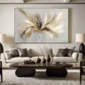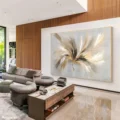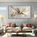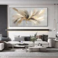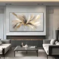 Bức tranh mang đến một cảm giác nhẹ nhàng và thư thái, với những đường nét mềm mại và màu sắc hòa quyện tinh tế. Những gam màu vàng, đen và trắng tạo nên sự tương phản nổi bật, khiến ánh sáng như đang nhảy múa trên bề mặt. Hình ảnh trừu tượng gợi lên sự chuyển động và năng lượng, như một vũ điệu của ánh sáng trong không gian mở. Kỹ thuật vẽ phẳng giúp tăng cường sự hiện đại và tinh tế, làm cho bức tranh trở thành tâm điểm thu hút ánh nhìn trong bất kỳ không gian nào.