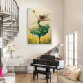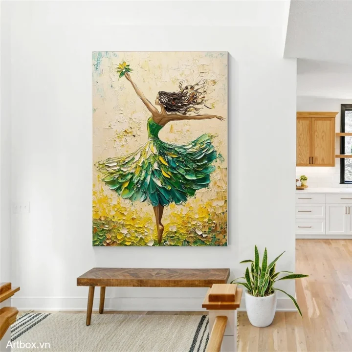 Bức tranh khắc họa hình ảnh một người phụ nữ đang nhảy múa, thể hiện sự tự do và niềm vui sống. Chiếc váy của cô được tạo nên từ những mảnh lá xanh tươi mát, hòa quyện với sắc vàng rực rỡ của hoa cỏ xung quanh. Kỹ thuật texture nổi mang lại chiều sâu cho bức tranh, tạo cảm giác sống động và gần gũi. Màu sắc đa dạng và tươi sáng không chỉ thu hút ánh nhìn mà còn mang đến cảm giác vui tươi, tràn đầy sức sống. Bức tranh như một lời mời gọi về vẻ đẹp của thiên nhiên và sự hòa quyện giữa con người và môi trường xung quanh.