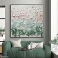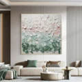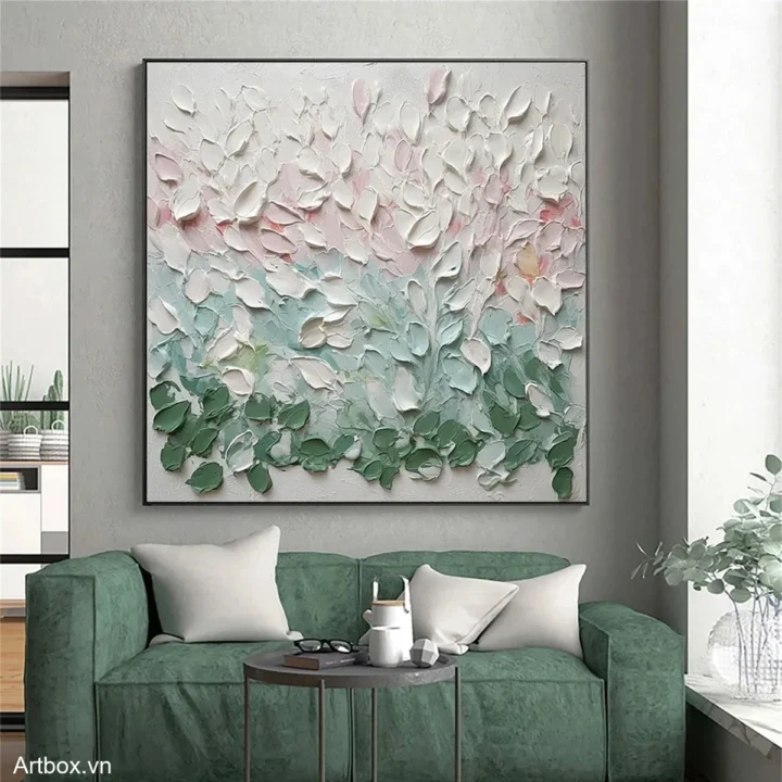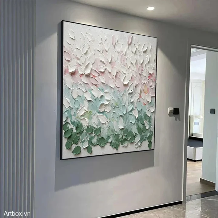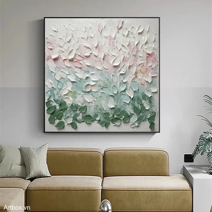 Bức tranh mang đến cảm giác như một khu vườn hoa nở rộ, với những cánh hoa được thể hiện bằng kỹ thuật texture nổi, tạo chiều sâu và sự sống động. Màu sắc đa dạng từ hồng nhạt, trắng đến xanh lá, hòa quyện một cách tinh tế, gợi lên sự tươi mới và dịu nhẹ. Những đường nét mềm mại và sự sắp xếp hài hòa của các cánh hoa tạo nên một bức tranh đầy cảm xúc, thích hợp cho không gian sống hiện đại, mang lại cảm giác ấm cúng và thư giãn cho người chiêm ngưỡng.