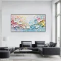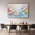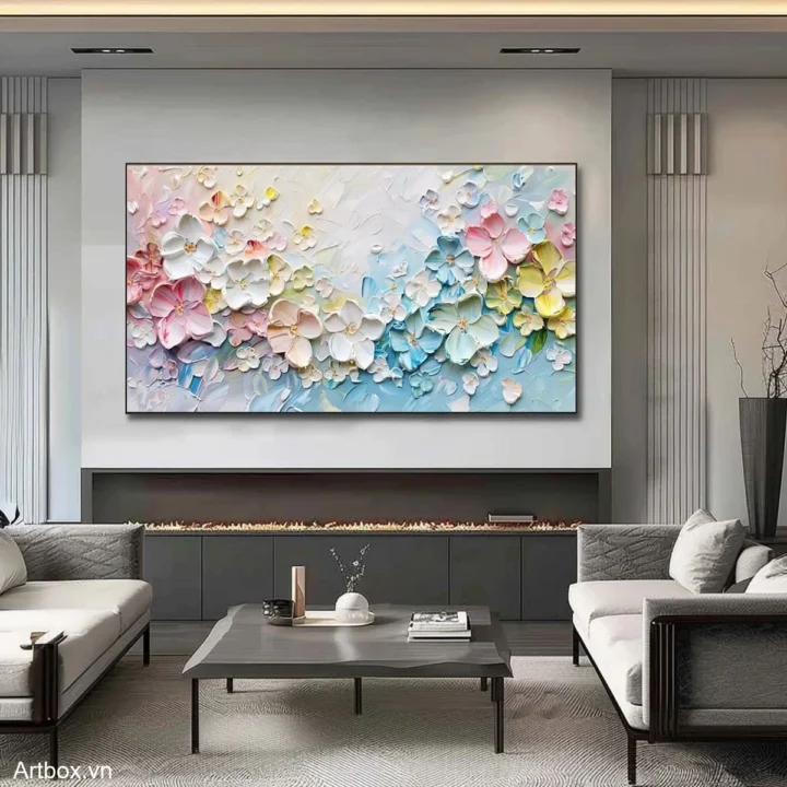 Bức tranh mang đến một không gian tươi mới với những bông hoa nở rộ, được thể hiện bằng kỹ thuật texture nổi, tạo cảm giác sống động và gần gũi. Màu sắc pastel nhẹ nhàng hòa quyện giữa hồng, xanh và vàng, mang lại cảm giác dịu nhẹ và ấm cúng. Hình ảnh những bông hoa được bố trí khéo léo, như một vườn hoa mộng mơ, gợi lên cảm xúc thư thái và bình yên. Tranh không chỉ là một tác phẩm nghệ thuật mà còn là một điểm nhấn tinh tế cho không gian sống, mang lại sự ấm áp và sự sống động cho bất kỳ căn phòng nào.