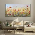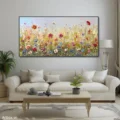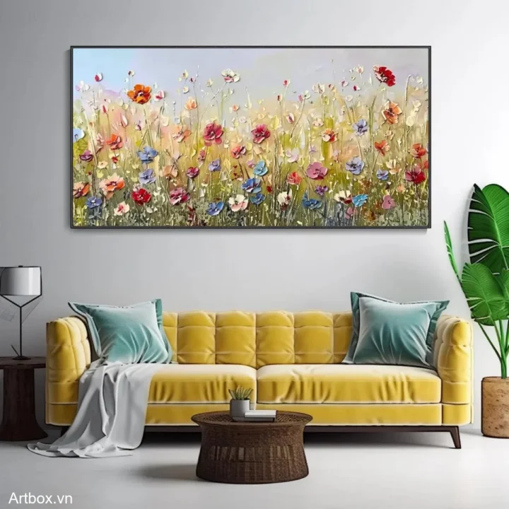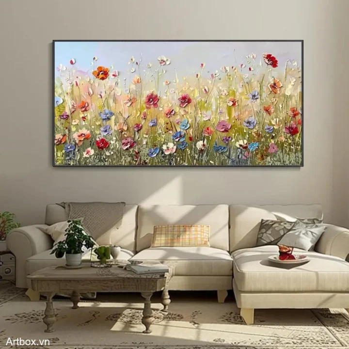 Bức tranh mang đến một không gian rực rỡ với những bông hoa nở rộ trong ánh nắng sớm. Sự kết hợp của các sắc màu tươi sáng như đỏ, hồng, xanh và vàng tạo nên một bức tranh sống động, đầy sức sống. Kỹ thuật texture nổi làm cho từng bông hoa trở nên sống động hơn, như thể chúng đang rung rinh trong gió. Cảm giác vui tươi và dịu nhẹ từ bức tranh khiến cho người xem cảm thấy thư thái, gần gũi với thiên nhiên. Đây là một tác phẩm hoàn hảo để trang trí cho không gian sống, mang lại sự tươi mới và ấm áp cho căn phòng.