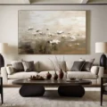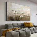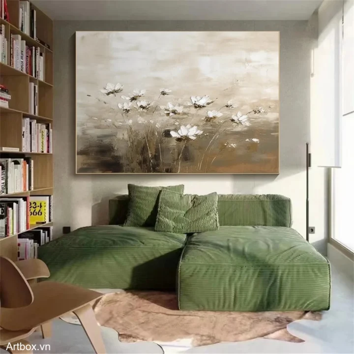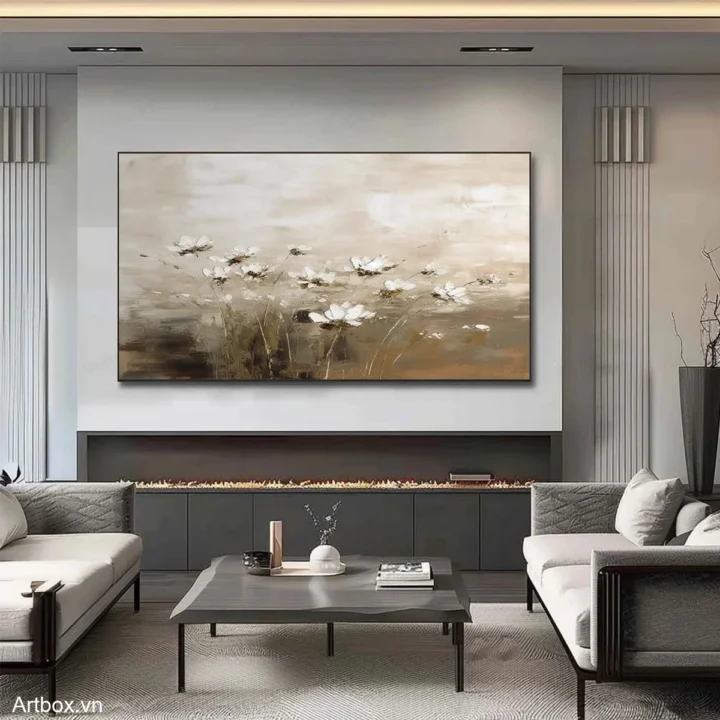 Bức tranh mang đến một không gian yên bình với hình ảnh những bông hoa nở rộ giữa nền nâu be nhẹ nhàng. Các chi tiết hoa được thể hiện bằng những nét vẽ mềm mại, tạo cảm giác như đang đón nhận ánh nắng sớm mai. Sự hòa quyện giữa các tông màu trung tính mang lại cảm giác dịu nhẹ, ấm áp, phù hợp cho những không gian thư giãn. Kỹ thuật texture nổi tạo chiều sâu và sinh động cho bức tranh, khiến nó trở thành điểm nhấn hoàn hảo cho phòng khách hay phòng ngủ, mang lại cảm giác gần gũi và thân thuộc.