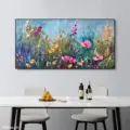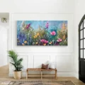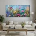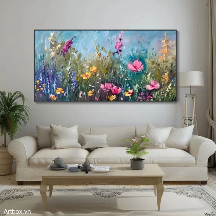 Bức tranh mang đến một không gian rực rỡ với những bông hoa đủ màu sắc, từ hồng thắm đến vàng tươi, hòa quyện trong nền xanh mát. Các đường nét được thể hiện bằng kỹ thuật texture nổi, tạo cảm giác sống động và gần gũi với thiên nhiên. Cảm xúc vui tươi và dịu nhẹ lan tỏa từ từng cánh hoa, như một bản giao hưởng của sắc màu trong ánh sáng. Bức tranh không chỉ là một tác phẩm nghệ thuật, mà còn là một lời mời gọi khám phá vẻ đẹp đơn giản nhưng đầy sức sống của mùa hè.